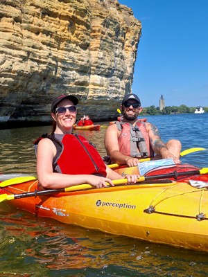 Our Starved Rock Guided Kayak Tour lasts approximately 2 hours. During the tour, you’ll paddle along scenic waterways, explore towering sandstone bluffs, and enjoy up-close views of Starved Rock’s stunning canyons and wildlife.